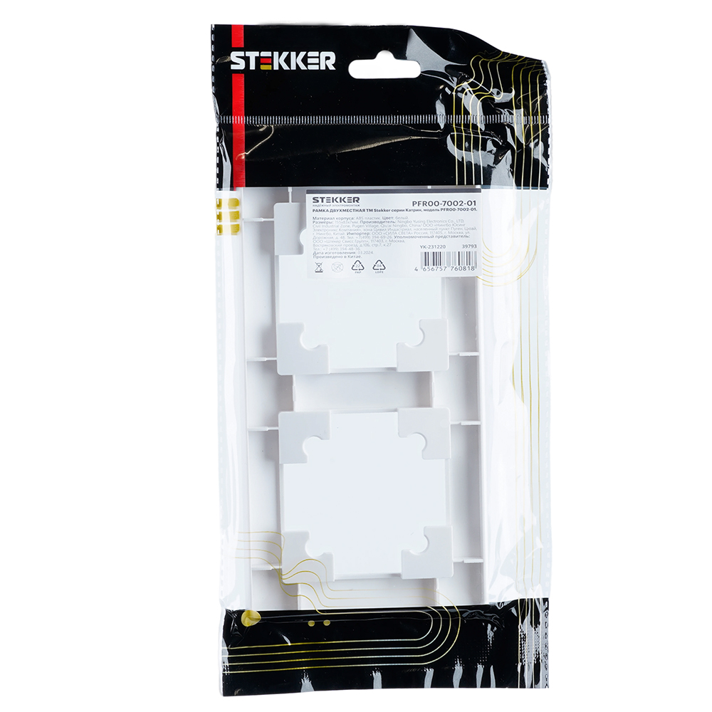 Рамка  STEKKER PFR00-7002-01 на  гнездо, , . Материал: ABS пластик, цвет белый, размер 155*83*7мм. Номинальное напряжение , номинальный ток , диапазон рабочих температур ,