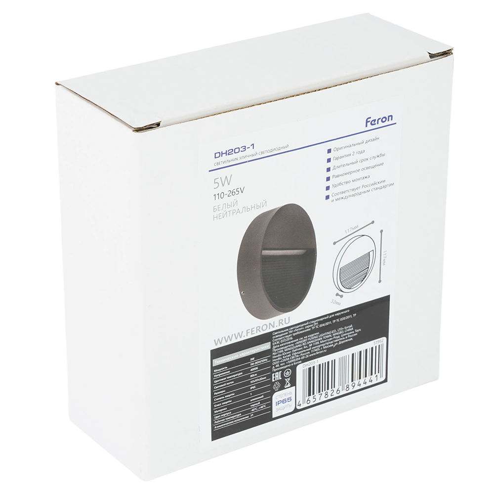 Светильник уличный светодиодный, накладной (ДБУ) FERON DH203-1, серия Чикаго, 5W, 4000К (белый натуральный), 110-265V/50Гц, 80Lm, IP65, 30LED*SMD, класс защиты 1, раб.t -40°C...+40°C, цвет серый, корпус алюминий, 117*117*32мм,